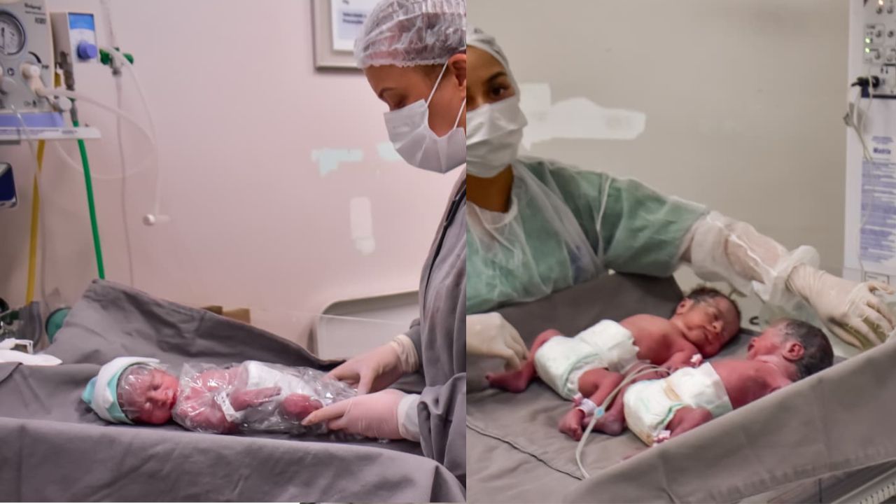 O parto ocorreu por volta das 16h, com poucos minutos de diferença entre os nascimentos. As crianças precisaram de suporte respiratório e foram encaminhadas para a Unidade de Terapia Intensiva Neonatal (UTIN), onde permanecem internadas para acompanhamento e ganho de peso.