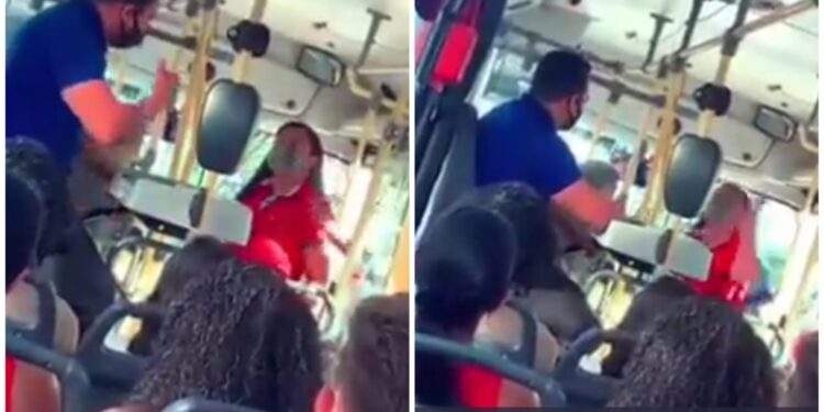 Em um vídeo publicado, a mulher aparece visivelmente irritada, xingando o cobrador e tentando quebrar o caixa do busão. O homem, por sua vez, perde a paciência e chega a levantar do seu assento para estapear a mulher, que sai de perto.