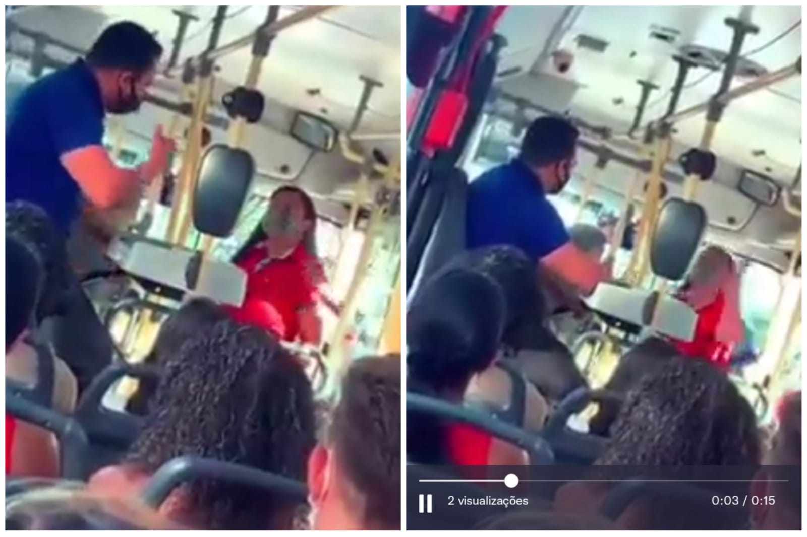 Em um vídeo publicado, a mulher aparece visivelmente irritada, xingando o cobrador e tentando quebrar o caixa do busão. O homem, por sua vez, perde a paciência e chega a levantar do seu assento para estapear a mulher, que sai de perto.