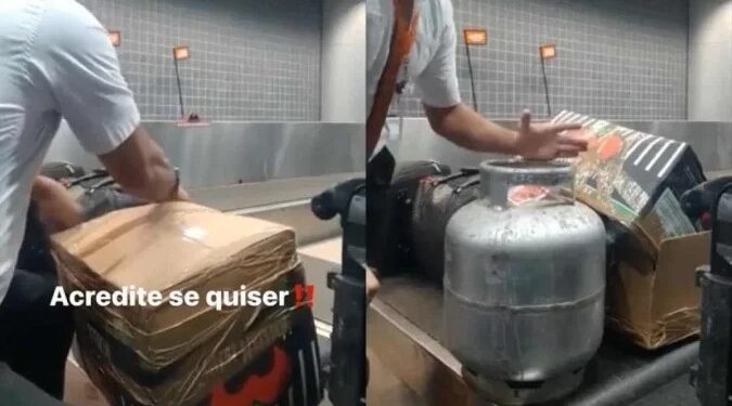 Nas imagens, um funcionário da empresa aérea aparece desembrulhando um pacote que a cliente pretendia despachar. Ao terminar, nota-se que dentro da caixa havia um botijão de gás de cozinha.