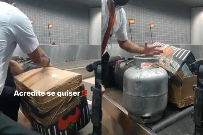 Nas imagens, um funcionário da empresa aérea aparece desembrulhando um pacote que a cliente pretendia despachar. Ao terminar, nota-se que dentro da caixa havia um botijão de gás de cozinha.