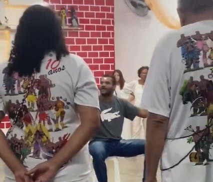 Nas imagens, há várias pessoas de branco em roda e o homem se senta numa cadeira, no meio, e aponta para todos. Aparentando estar exaltado, ele desafia o pai de santo: “É duelo”, diz ele, que continua falando várias coisas tentando convencer os presentes.