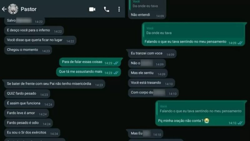 Em outros trechos das mensagens, mais ameaças do pastor: “Eu sou o senhor dos exércitos, o criador dos céus e da terra, ninguém pode me vencer. Se você não mandar mensagem amanhã de dentro do ônibus, tudo que eu disse ao seu respeito vai se cumprir”.