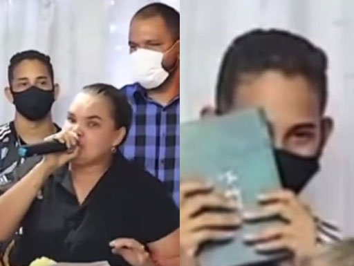No momento em que a religiosa disse essa frase, a reação da igreja foi ficar em silêncio. Enquanto que no altar, atrás da mulher, alguns homens aplaudiram e outros tentaram se esconder atrás das Bíblias. O que chamou a tenção foi um jovem arregalando os olhos, espantado com o que estava ouvindo.
