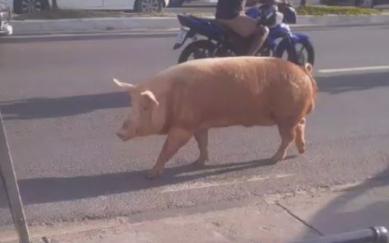Um porco gigante foi filmado dando um rolé nas ruas de Manaus nesta terça-feira (6). O trânsito na Silves, bairro Cachoeirinha, parou para ver o suíno passar.