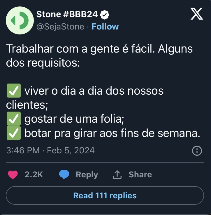 No perfil da Stone no X, a empresa aproveitou a interação e fez uma publicação sobre o acontecimento.