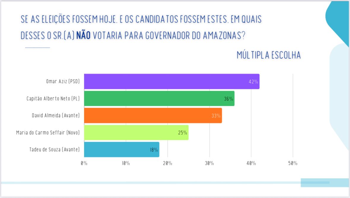A pesquisa Real Time Big Data também avaliou a rejeição dos possíveis candidatos às Eleições 2026. Entre todos, a Professora tem apenas 25% da rejeição, a menor. O atual prefeito de Manaus, David Almeida (Avante), por exemplo, aparece com alto índice de rejeição: 33%.