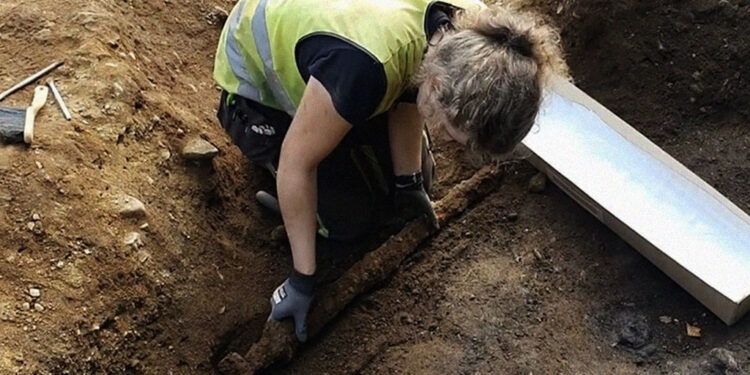 O local onde a espada estava funcionava como uma fazenda viking nos séculos 9 e 10, que também era feita de cemitério. As escavações aconteceram por conta da ampliação de uma rodovia que passa por lá. A espada, fortemente corroída, foi descrita pelos arqueólogos como “muito pesada”.