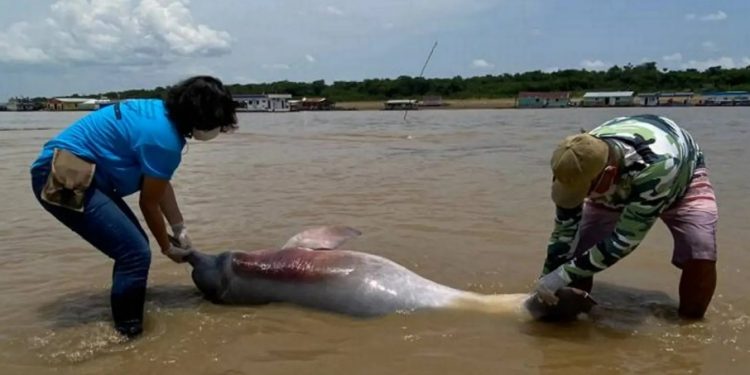 AMAZONAS – As imagens de mais de 100 botos mortos no Lago Tefé “superaquecido!”, no interior do Amazonas, repercutem em todo mundo neste sábado (30), como uma das mais fortes da estiagem que castiga a Amazônia. Pesquisadores recolhem os animais mortos e levam para estudo, na vontade de descobrir a causa da mortandade sem precedentes.