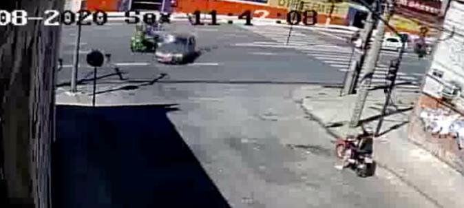 Câmeras de segurança filmaram o momento em que um siena avança o sinal de trânsito e atinge duas motos. Uma das vítimas não resistiu ao impacto e acabou morrendo; a outra segue internada. O motorista foi preso pela PM,