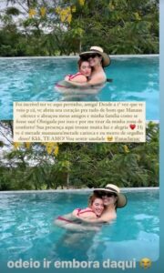 “Acabou-se o que era doce”, disse a artista, que prometeu “voltar no ano que vem”. Teve ainda declaração da amiga e também ex-BBB Vivian Amorim, com que Ana Clara dividiu parte das férias. “Metade carioca, metade manauara”, brincou a amiga.