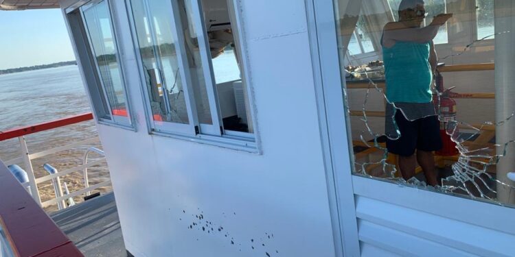 AMAZONAS (AM) – Uma embarcação transportando 8 milhões de combustível, da empresa Nave Amazônia Navegação Ltda., foi atacada por piratas do rio na madrugada desta segunda-feira (11), no rio Madeira. Fortemente armados, eles dispararam tiros e quebraram os vidros.
