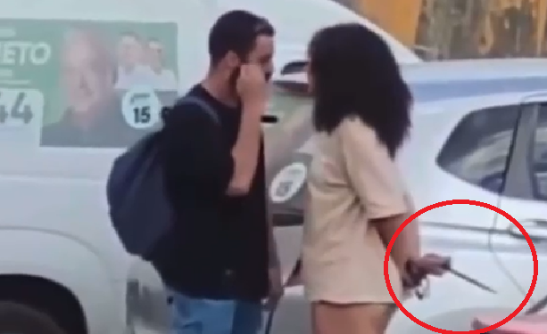 Nas imagens, ela está com o celular na mão e também esconde uma faca atrás das costas. Ela agride o homem e o ameaça, chegando a apontar a arma branca para a cara dela.