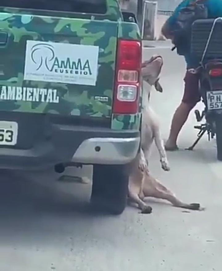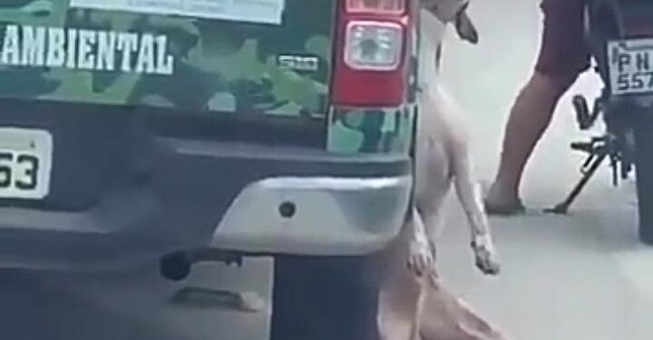 EUSÉBIO – CE | Um pit bull foi flagrado sendo arrastado pelo pescoço por uma corda, na tarde desta quarta-feira (18), no município de Eusébio, interior do Ceará. Ele estava sendo transportado na carroceria de uma caminhonete de prefeitura da cidade. O cachorro teria pulado do carro sem que os guardas notassem a cena. Alguns pedestres e outros condutores avisaram aos funcionários que conduziam o veículo e, então, o animal foi colocado de volta à caminhonete.