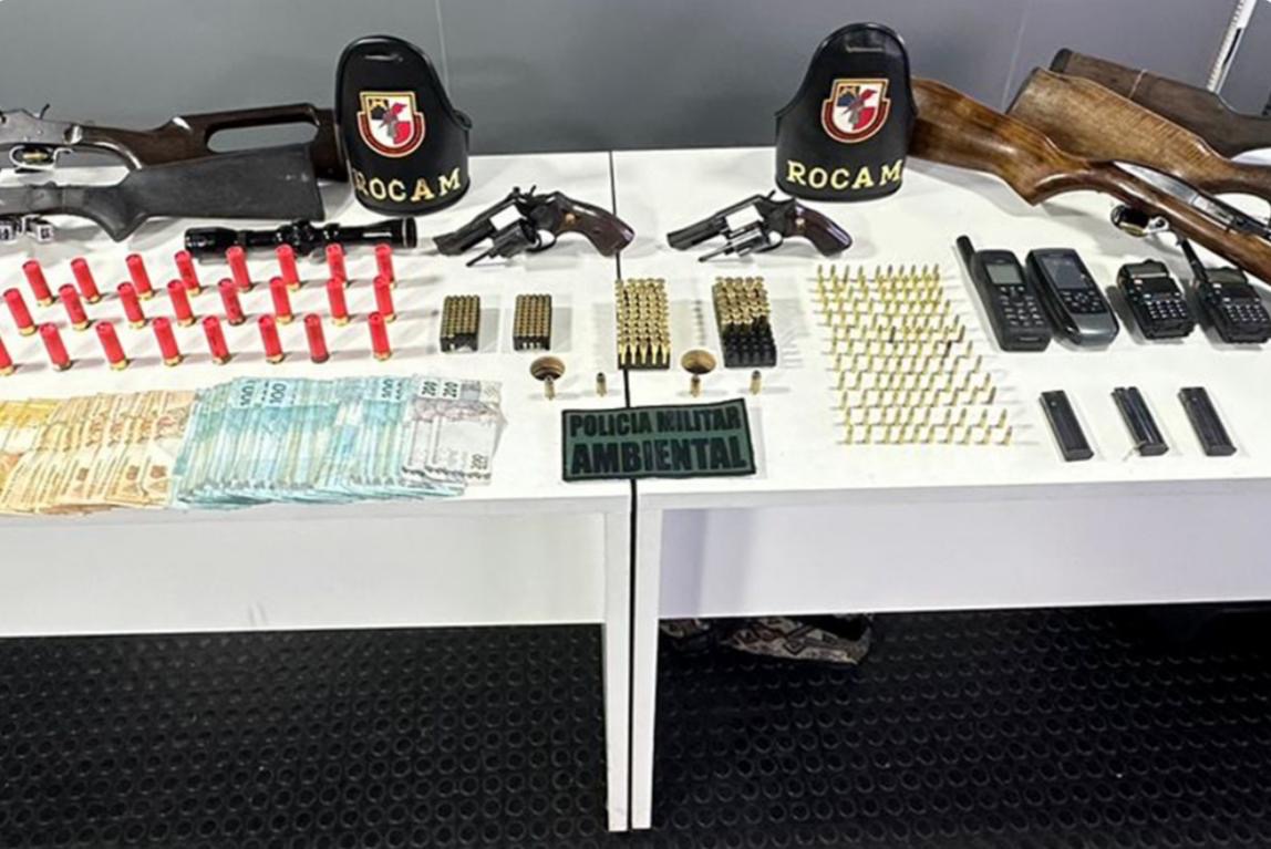 Ao todo, foram apreendidos dois revólveres calibre 38; um rifle calibre 22; quatro espingardas de diferentes calibres; uma luneta e três carregadores de munições. Também foram apreendidas 339 munições de diferentes calibres; dois rádios comunicadores; um GPS; e um rádio que funciona por meio de satélite.