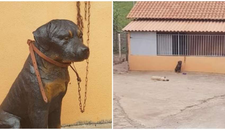 Ainda de acordo com a PM, o falso cachorro era mantido nos fundos propriedade pertencente a um casal de idosos.