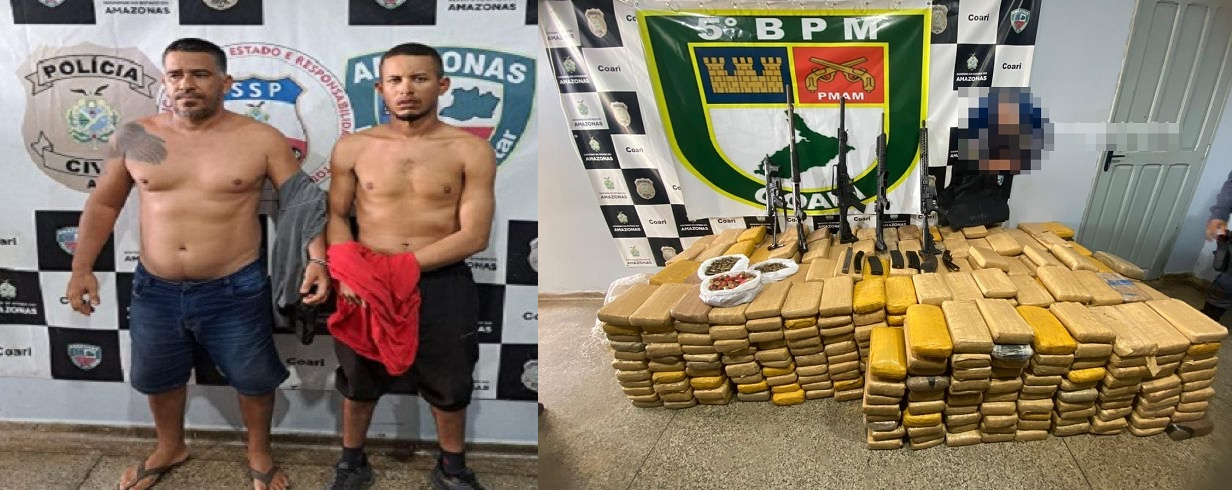 COARI (AM) – Policiais do 5º Batalhão de Polícia Militar (BPM) detiveram, na madrugada deste sábado (29), Eron Paz, de 41 anos, e Ronielson da Silva Abreu, de 29 anos, por tráfico de drogas e porte ilegal de arma de fogo, no município de Coari (a 363 quilômetros de Manaus). Na ação, foram apreendidas cinco armas de grosso calibre e munições.