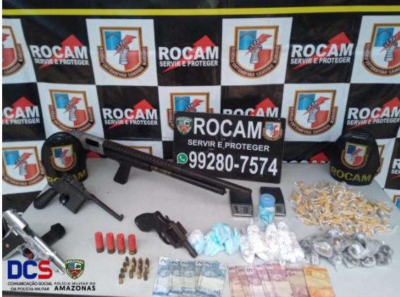 Policiais das Rondas Ostensivas Cândido Mariano (Rocam) apreenderam um adolescente de 17 anos na rua Lagoa de Dentro, bairro Zumbi, zona leste. Ele estava com 483 porções de cocaína, um revólver calibre 38, duas pistolas calibre 9mm, uma espingarda, 17 munições intactas e duas balanças de precisão.