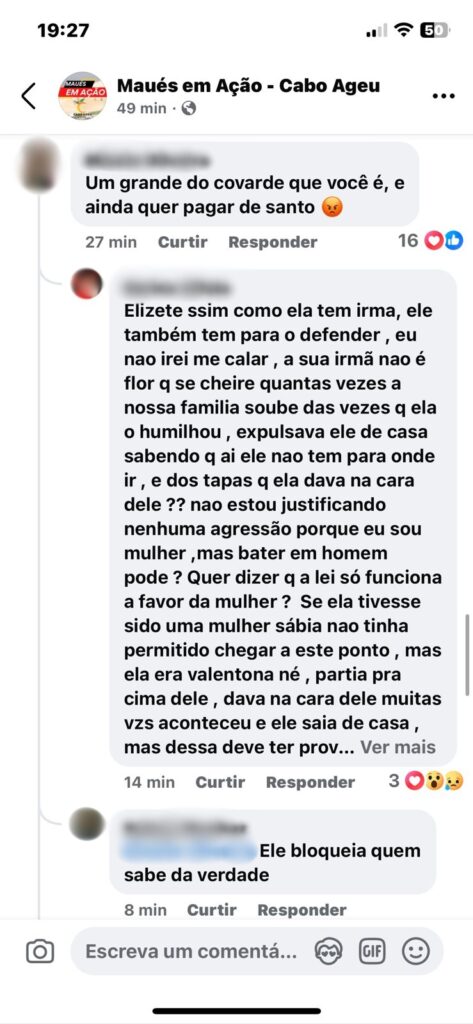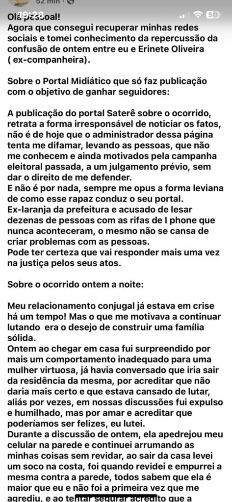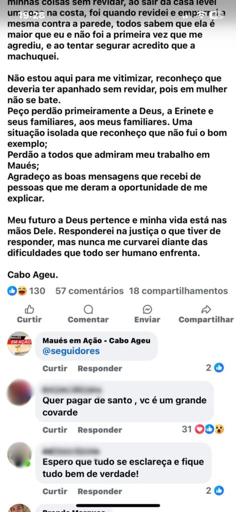 Ageu disse que teve o celular apedrejado na parede e ainda levou um soco nas costas, momento em que revidou e a empurrou na parede. “E ao tentar segurar acredito que a machuquei”, justificou. A publicação foi apagada em seguida após muitas críticas.