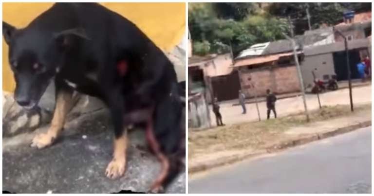 No video, os policiais estão conversando com moradores, quando o cachorro se aproxima da aquipe e os disparos são feitos contra o pet. A moça que gravou mostra indignação em sua fala pelo ato cruel.