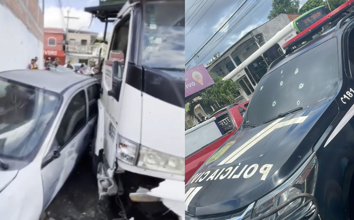 Os homens também resolveram reagir, disparando vários tiros, e os policiais foram atingidos no braço, de raspão, após a troca de tiros. Na fuga, eles entraram em um carro Cronos, bateram em vários veículos e depois seguiram a pé.