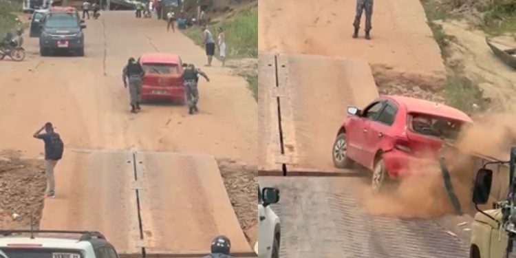 HUMAITÁ (AM) – Um vídeo gravado no porto de Humaitá, município do Amazonas, mostra o momento em que policiais militares tentam ajudar uma condutora a subir uma ladeira, mas o veículo fica descontrolado, desce desgovernado e bate na balsa.