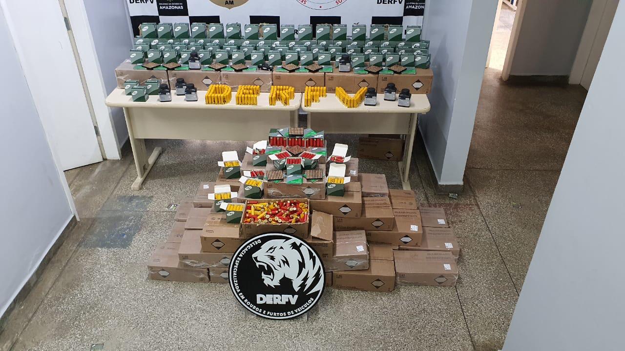 MANAUS-AM | Na madrugada de quarta-feira (24/06), por volta das 3h, as equipes da Delegacia Especializada em Roubos e Furtos de Veículos (DERFV) deflagraram uma ação policial que culminou na apreensão de cerca de 10 mil munições de origem clandestina e uma motocicleta roubada com documentos falsificados. A carga foi apreendida em uma embarcação, que estava atracada no porto da feira da Panair, situado no bairro Educandos, zona sul de Manaus.