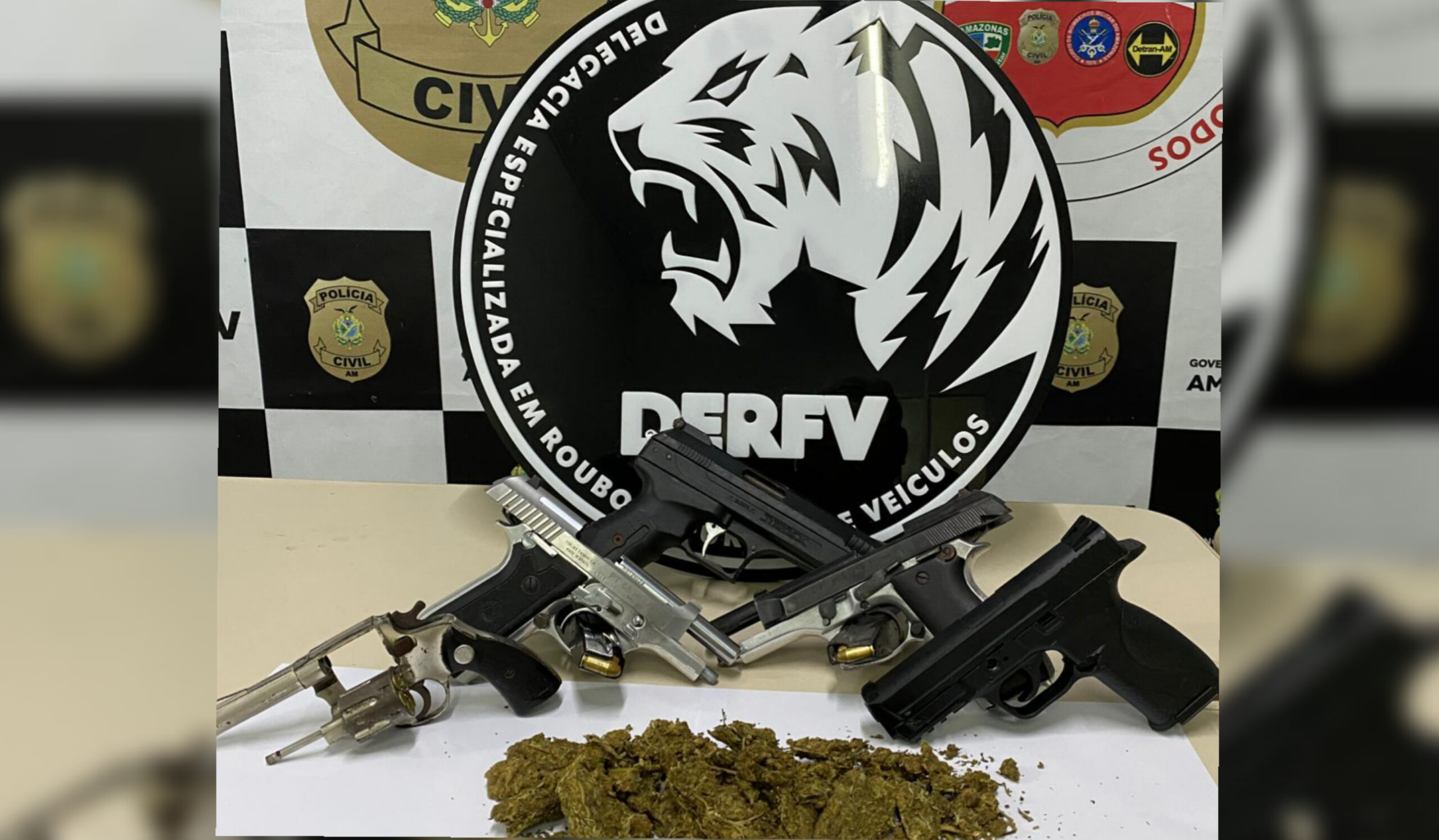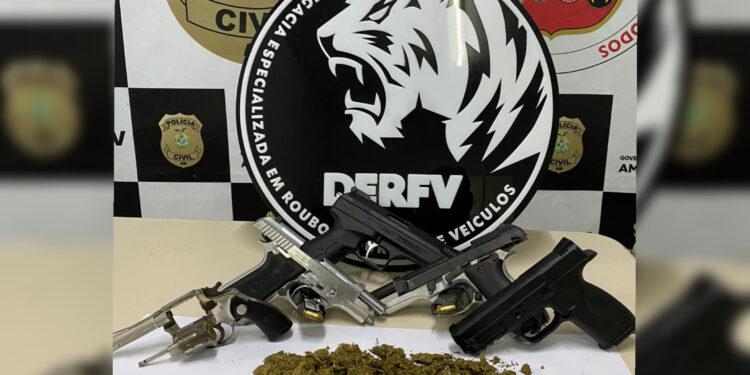 MANAUS-AM|Equipes de investigação da Delegacia Especializada em Roubos e Furtos de Veículos (DERFV) deflagraram a operação denominada “Kerioth”, na tarde do último sábado (09/05), por volta das 17h, que resultou nas prisões de Bismark Miranda do Nascimento, 30, e Lucas Farias Gonçalves, 24. As prisões ocorreram em um sítio, no bairro Tarumã-Açu, zona oeste da capital. Com a dupla foram apreendidas armas de fogo, munições, entorpecente, além de três veículos possivelmente com restrições de roubos ou furtos.