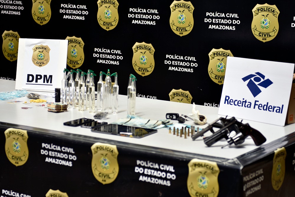 Manaus – O delegado Marcelo Martins, titular do 24º Distrito Integrado de Polícia (DIP), acompanhado dos delegados George Gomes e Divanilson Cavalcanti, diretor e titular, respectivamente, do Departamento de Polícia Metropolitana (DPM) e 1ª Seccional Sul, falou na manhã desta sexta-feira (7/6), durante coletiva de imprensa realizada às 11h30, no prédio da Delegacia Geral, sobre as prisões, em flagrante, de Alisson Luiz de Souza Izidoro, 33; Anderson Gabriel Queiroz Mesquita, 24; Brena Raquel Mourão Gonçalves, 27, e Thiago Morais Pandura, 25, com duas armas de fogo, munições e drogas sintéticas.