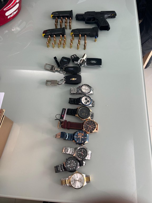 Uma prisão em flagrante. Apreensões de cinco armas de fogo, munições, documentos, aparelhos eletrônicos e artigos de luxo.