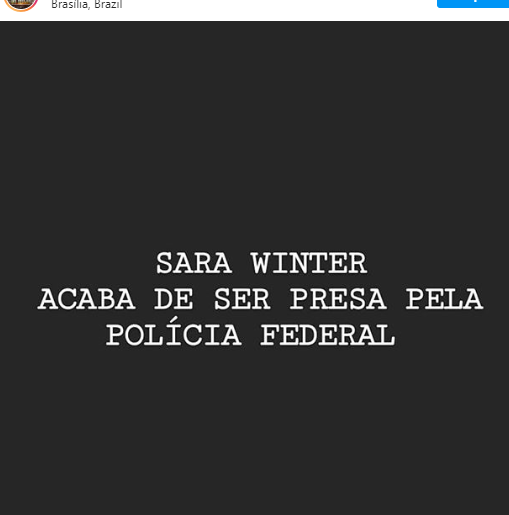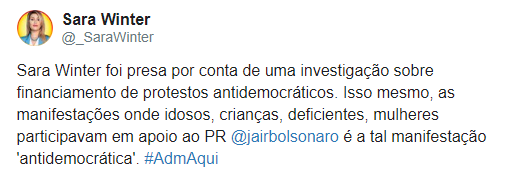 “Sara Winter foi presa por conta de uma investigação sobre financiamento de protestos antidemocráticos. Isso mesmo, as manifestações onde idosos, crianças, deficientes, mulheres participavam em apoio ao PR @jairbolsonaro é a tal manifestação ‘antidemocrática’”, diz o texto, assinado por alguém que se identificou como “Adm” [administrador] da conta.