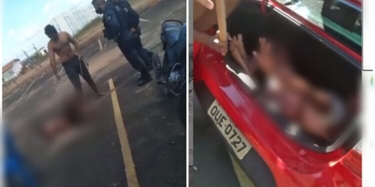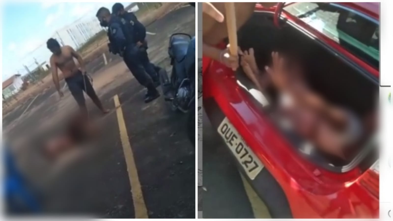 Outro vídeo mostra a suspeita amarrada no porta-malas de um carro enquanto é agredida por pelo menos dois homens que usam um pedaço de madeira. Crianças presenciam a cena.