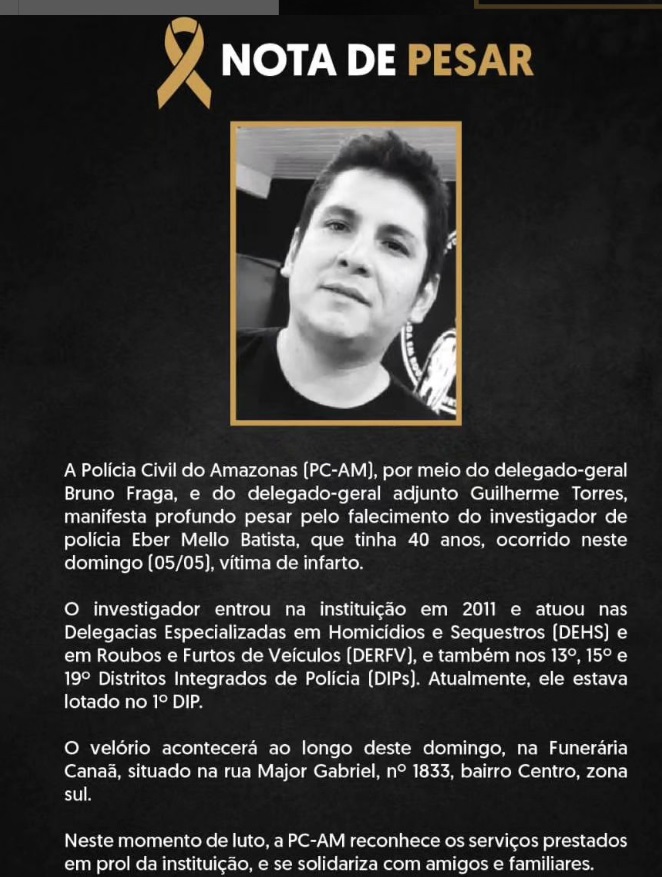 MANAUS – Morreu neste domingo (5), em Manaus, o investigador da Polícia Civil do Amazonas, Eber Mello Batista. De acordo com a polícia, ele foi vítima de infarto.