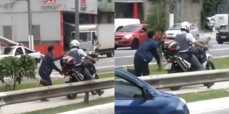 O momento foi gravado nesta terça-feira (30) na Avenida Professor Luiz Ignácio de Anhaia Mello, na região da Vila Prudente, Zona Leste de São Paulo. O policial pilota a moto na faixa de ciclistas da avenida.