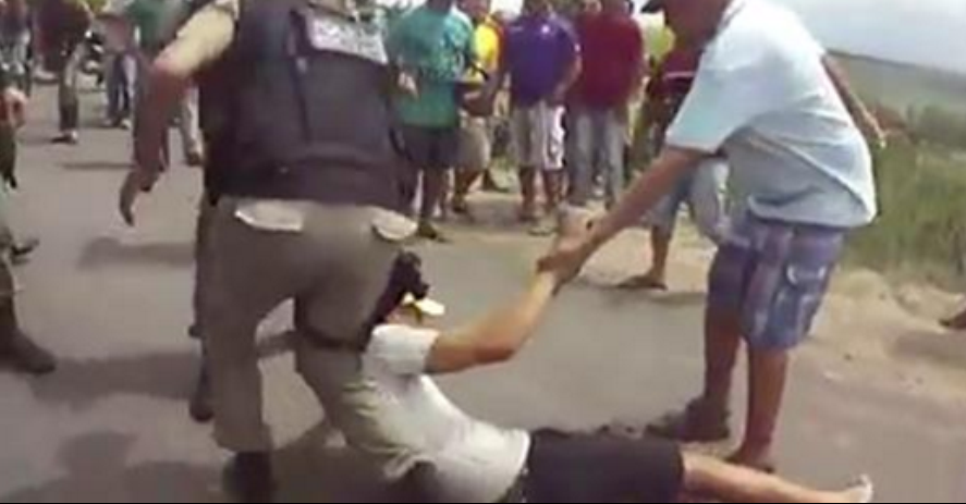 Após a queda da vítima, os policiais o arrastam pelo asfalto até a viatura da Polícia Militar e o colocam na parte de trás da caminhonete. O veículo então deixa o local, sob gritos dos manifestantes.