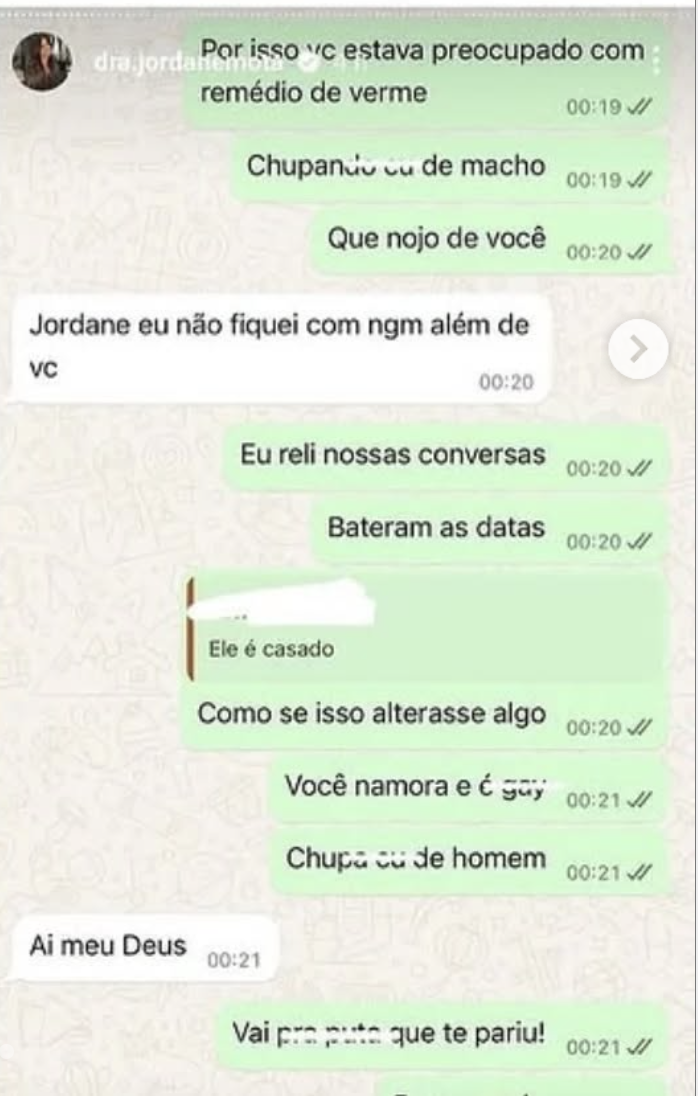 Uma pessoa escreveu: “A polícia do estado de Goiás inteira já sabia“, e ela responde: “Menos eu. Vocês nem pra avisar“. Em outra: “Você está expondo a pessoa errada, todo mundo sabe que o amante do seu marido é outro gerente“, e Jordane responde: “São vários“.