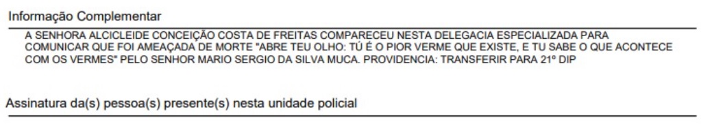A ocorrência está registrada no 21º DIP. “Abre teu olho, tu é o pior verme que existe e tu sabe o que acontece com os vermes.”, relatou a sargento no B.O. Apesar disso os dois continuaram trabalhando no mesmo lugar, como armeiros da 10ª Cicom.