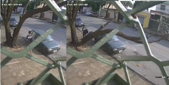 Câmeras de segurança da região conseguiram flagrar o momento em que o rapaz passou ao lado da árvore, que caiu logo em seguida. Embora não tenha ferido o jovem, é possível ver que a estrutura se rompeu perto da raiz e despencou em cima de um carro que estava estacionado próximo a ela.