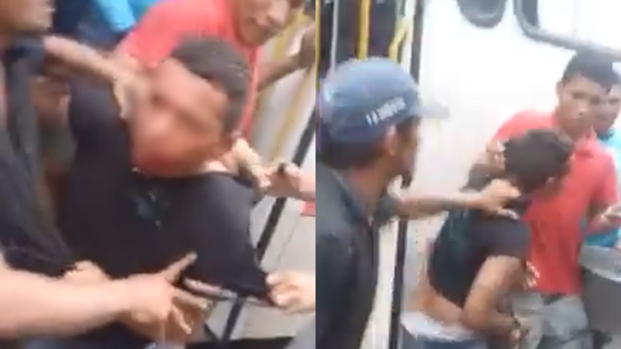 O vídeo registrado por um rapaz mostra vários passageiros dando socos no criminoso, e ele mesmo grita: “Porrada no ladrão”.