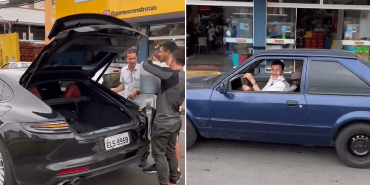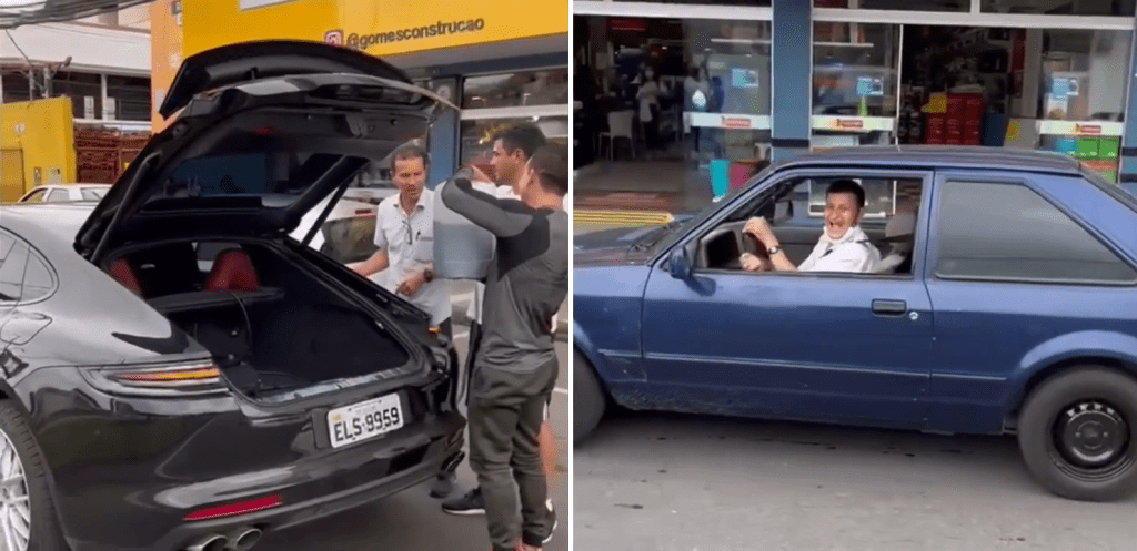 Enquanto abasteciam o Porsche , o autor do vídeo mostrou o congestionamento e brincou com o motorista de um Escort que passava ao lado. “Gasolina, irmão. Não dá para tirar um pouquinho desse carro para nós (sic) colocar aqui, não? Tá cara, subiu demais o preço”.