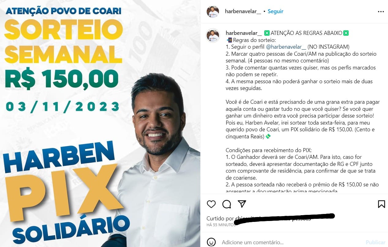 “Você é de Coari e está precisando de uma grana extra pra pagar aquela conta ou gastar tudo no que você quiser? Se você quer ganhar um dinheiro extra você precisa participar desse sorteio! Pois eu, Harben Avelar, irei sortear toda sexta-feira, para meu querido povo de Coari, um PIX solidário de R$ 150,00”.