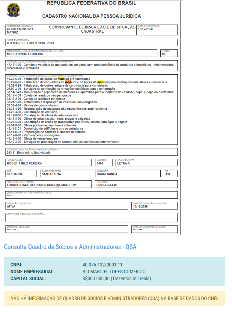 O CNPJ da empresa nº 40.076.132/0001-11 no site da Receita Federal, mostra que a empresa fica no bairro Santa Luzia, em Barreirinha. O ‘Mercadinho Ferreira’, vende produtos alimentícios e tem mais 86 atividades secundárias.