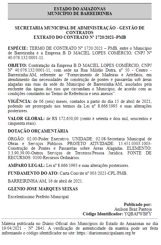 O contrato publicado no Diário Oficial dos Municípios (DOM) no dia 19 de abril, prevê pagamento de R$ 172.650,00 para a empresa B D MACIEL LOPES COMÉRCIO. “Fornecimento de Madeiras e Artefatos, em atendimento das necessidades de construção de pontes e passarelas sob áreas alagadas nas ruas da sede do Município de Barreirinha/AM, assolados pela enchente das águas dos rios que circundam o Município, de acordo com as condições constantes no Termo de Referência e seus anexos”, diz o documento.