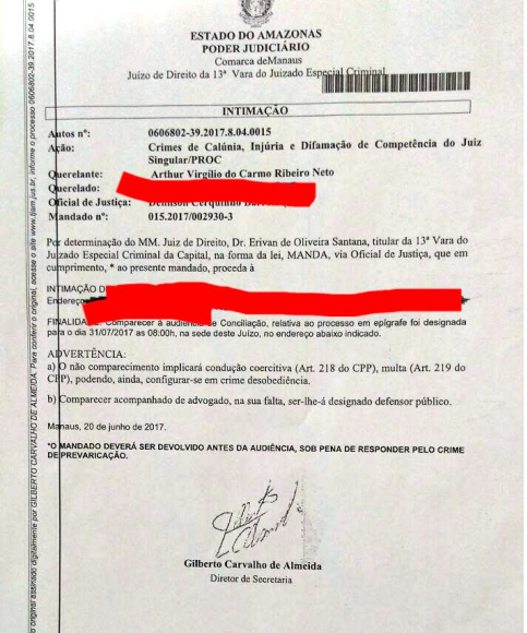 Manaus – O prefeito de Manaus, Arthur Neto (PSDB), processou o jornalista José Garcia, responsável pelo Blog do Pávulo, por ter postado matérias jornalísticas contra a gestão dele. A ação está registrada no número 06006802-39.2017.8..04.0015, tipificada no crime de calúnia, injúria e difamação. As informações são do Amazonas 1.