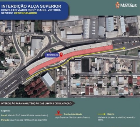 MANAUS – A Prefeitura de Manaus, por meio do Instituto Municipal de Mobilidade Urbana (IMMU), com o apoio da Secretaria Municipal de Obras (Seminf), irá interditar parcialmente, neste sábado, 11/2, no sentido bairro/Centro, uma pista da parte superior do viaduto do Manoa, localizado na avenida Max Teixeira, zona Norte, para que uma empresa particular realize a recuperação de buracos ocasionados no piso. A obra terá a duração de cinco dias e contará com o apoio dos agentes de trânsito para orientar os motoristas sobre os desvios.