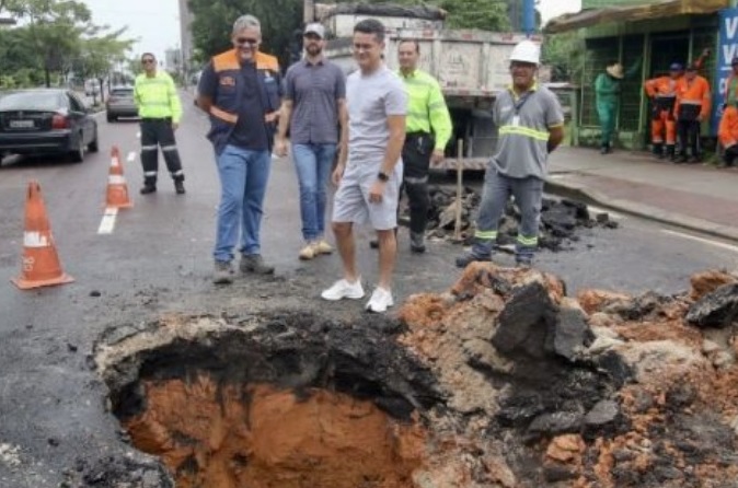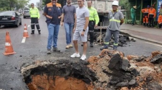 “A antiga rede drenagem que passa por aqui rompeu no tubo ármico, que tem mais de 25 anos. A orientação do prefeito David Almeida é que façamos uma nova linha de drenagem, com tecnologia de ponta, moderna e que proporcione segurança ao fluxo intenso da via. Para a execução da obra, precisaremos isolar a área. Estamos montando uma força-tarefa, avisando a população antecipadamente, para tentar dirimir os danos e os transtornos causados por essa intervenção”, explicou Renato Junior.