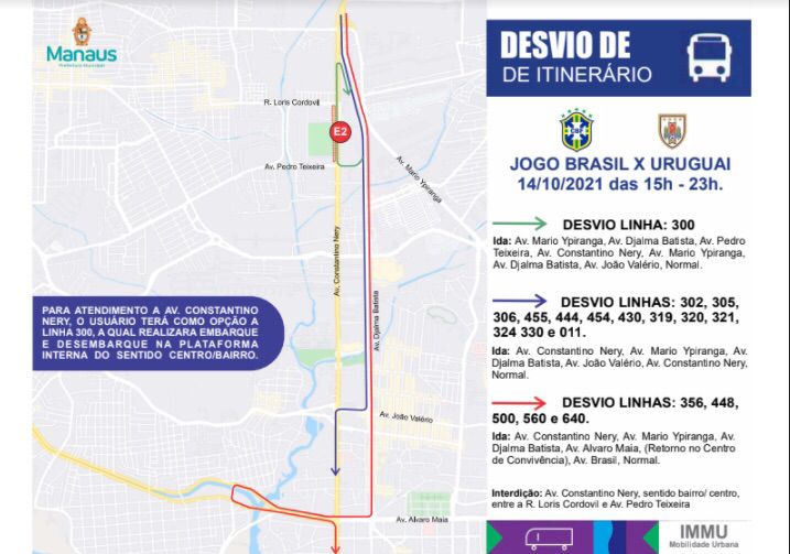 As linhas 356, 448, 500, 560 e 640, seguirão em direção ao Centro e serão desviados para o viaduto da avenida Mário Ypiranga, depois para a avenida Djalma Batista, seguem até o boulevard Álvaro Maia, depois fazem o retorno ao lado do Centro de Convivência da Família Magdalena Arce Daou, depois acessam a avenida Brasil e retornam para a avenida Constantino Nery e seguem itinerário normalmente para o T1 ou Centro.