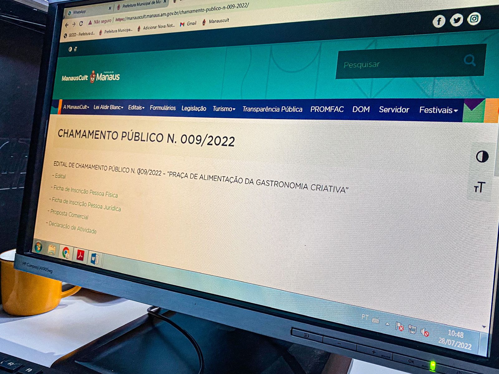 MANAUS (AM) – A Prefeitura de Manaus, por meio da Fundação Municipal de Cultura, Turismo e Eventos (Manauscult), lançou, na última terça-feira, 26/7, no Diário Oficial do Município (DOM), edição 5.392, caderno de número 1, o “Edital de Chamamento Público n.º 009/2022”, em forma de processo de seleção, para uso de espaço público de forma onerosa, nas praças de alimentação dos palcos Tucupi e Caboquinho, durante o festival #SouManaus Passo a Paço 2022, que acontecerá nos dias 3, 4, 5 e 6 de setembro deste ano, no Centro Histórico de Manaus. O edital fica aberto para inscrição até dia 8/8.