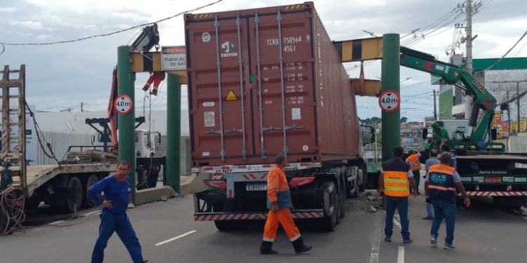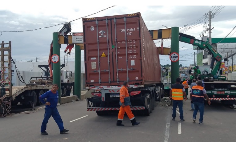 MANAUS – A Prefeitura de Manaus, por meio do Instituto Municipal de Mobilidade Urbana (IMMU) e da Secretaria Municipal de Infraestrutura (Seminf), realizou, neste sábado, 25/2, a retirada de duas estruturas do limitador de altura da passagem subterrânea do Complexo Viário Ministro Roberto Campos, no sentido João Valério para o São Jorge. As estruturas foram danificadas após uma carreta da empresa Oliva Pinto Logística se chocar com o limitador.