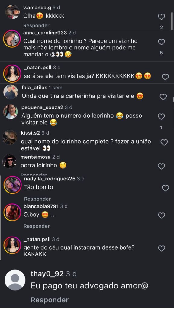 Nos comentários da publicação, internautas, homens e mulheres, fizeram elogios, brincadeiras e perguntas curiosas, como se ele tinha redes sociais ou se já estaria recebendo visitas. Enquanto isso, a polícia informou que o segundo envolvido é menor de idade e que a dupla estava em posse de um revólver.